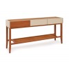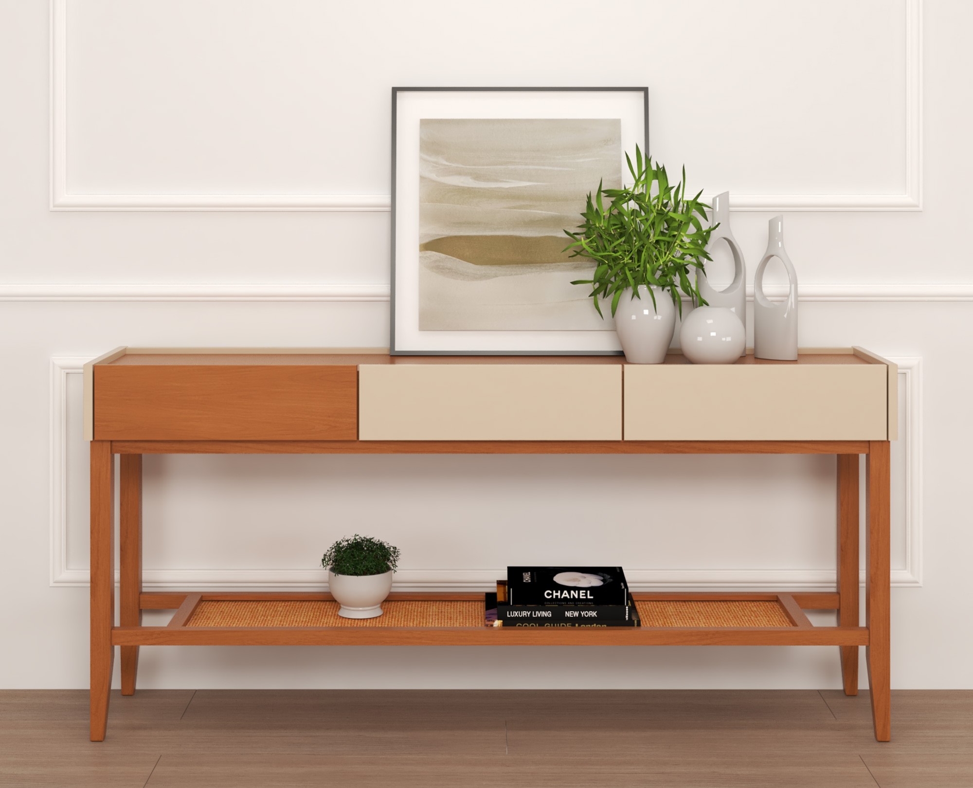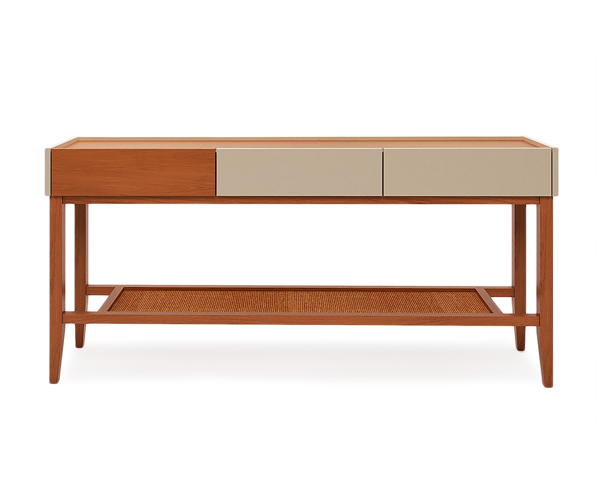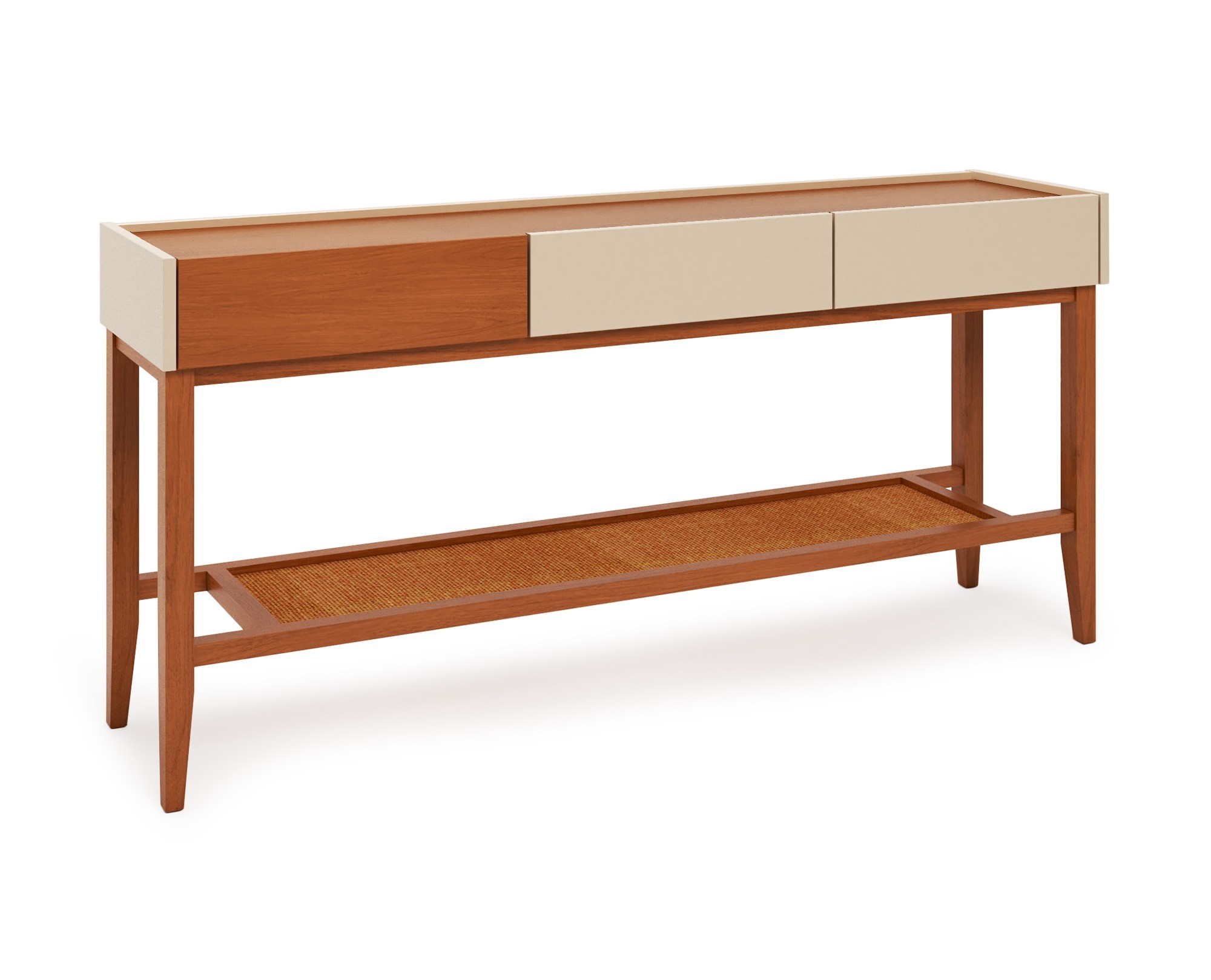 Sua estrutura é produzida em madeira maciça, com tampo e gavetas também maciços, revestidos em lâmina natural de madeira na cor Castanea, que valoriza os veios naturais. As partes coloridas do móvel são confeccionadas em MDF de 18 mm, com acabamento em pintura manual de laca fosca de alta qualidade. A prateleira inferior em palha (rattan) reforça o estilo bandeja, trazendo autenticidade ao design e ampliando a funcionalidade do aparador.